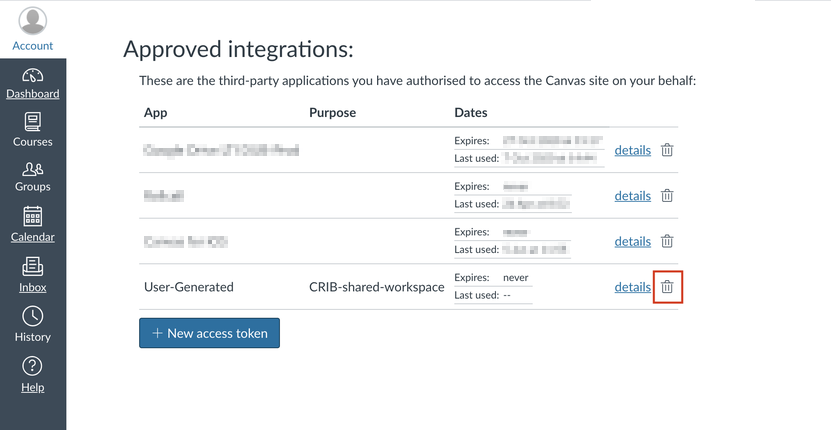 Finally, you should delete the access token you generated in step 2. To do this go to canvas.utwente.nl/profile/settings and scroll down to section Approved integrations. There, you can delete the token by clicking on the bin icon.
