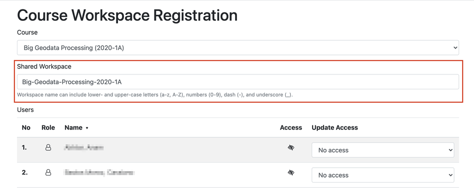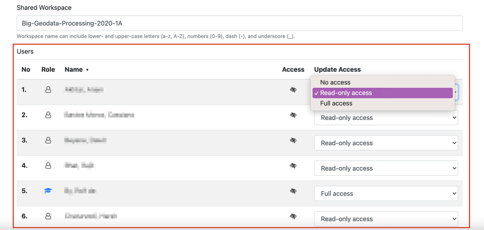 Set access rights for each person. Under the workspace name input, there is a Users table that contains persons that are involved in the selected course. In the column Update Access, you can set the access rights for the respective person. There are three types of rights: